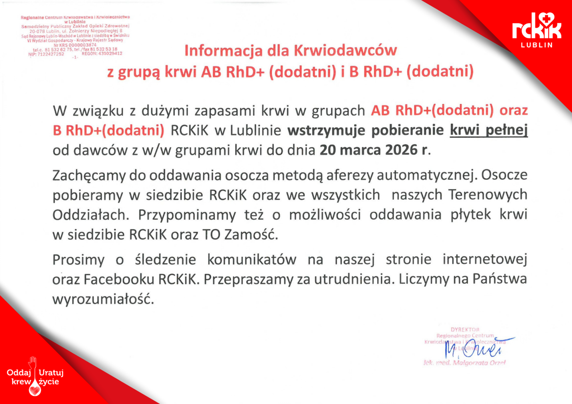 Regionalne Centrum Krwiodawstwa i Krwiolecznictwa informuje, że w 2025 r. kurs podstawowy z zasad krwiodawstwa i krwiolecznictwa dla pielęgniarek i położnych dokonujących przetaczania krwi i jej składników, będzie odbywać się w formie stacjonarnej w siedzibie RCKiK w Lublinie, ul. Żołnierzy Niepodległej 8, budynek B - Sala konferencyjno-szkoleniowa, natomiast kurs uzupełniający w formie e-learningu.