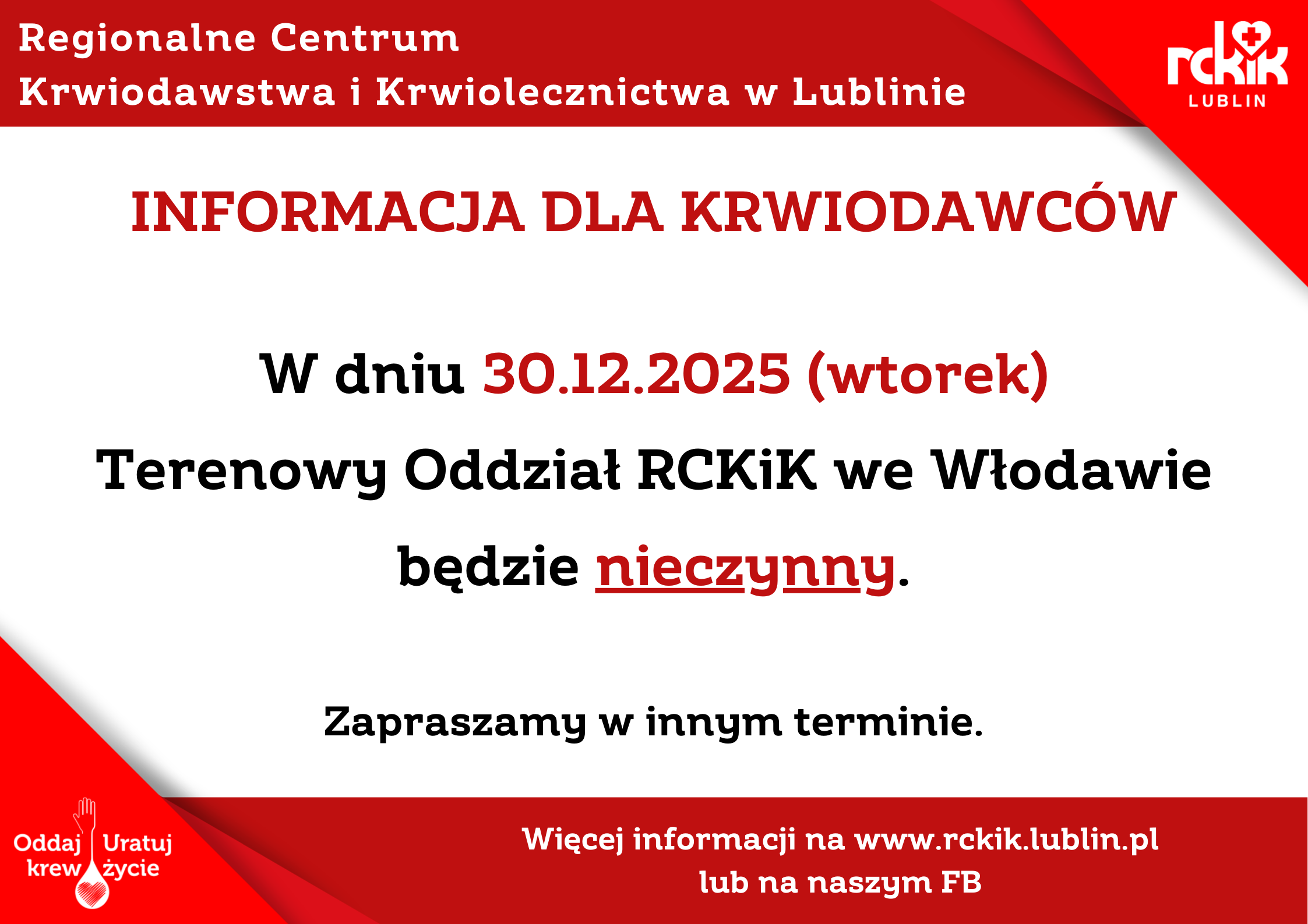 Regionalne Centrum Krwiodawstwa i Krwiolecznictwa informuje, że w 2025 r. kurs podstawowy z zasad krwiodawstwa i krwiolecznictwa dla pielęgniarek i położnych dokonujących przetaczania krwi i jej składników, będzie odbywać się w formie stacjonarnej w siedzibie RCKiK w Lublinie, ul. Żołnierzy Niepodległej 8, budynek B - Sala konferencyjno-szkoleniowa, natomiast kurs uzupełniający w formie e-learningu.